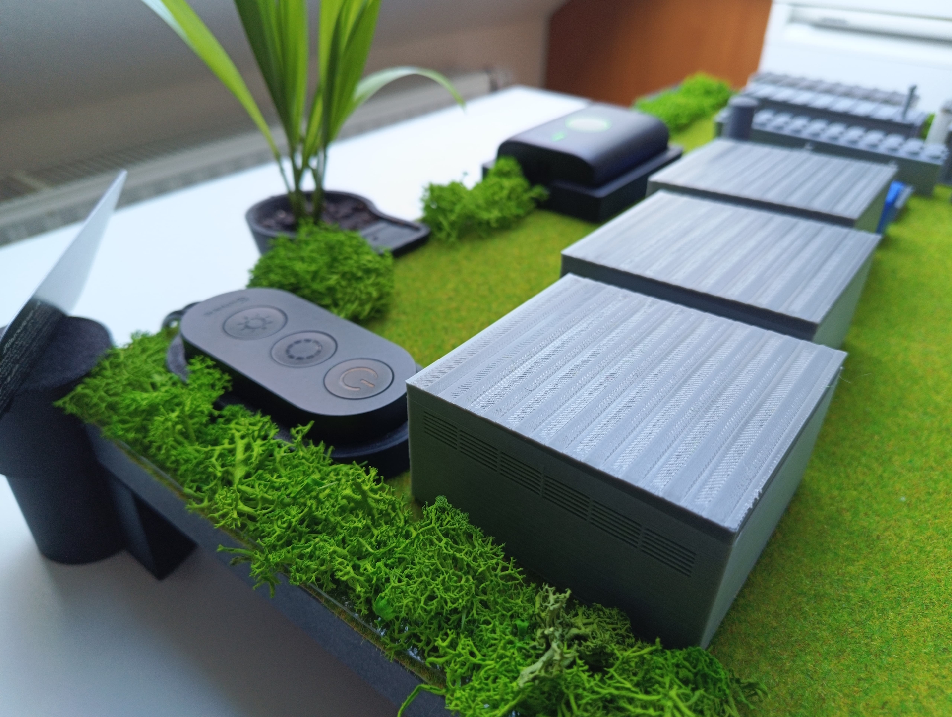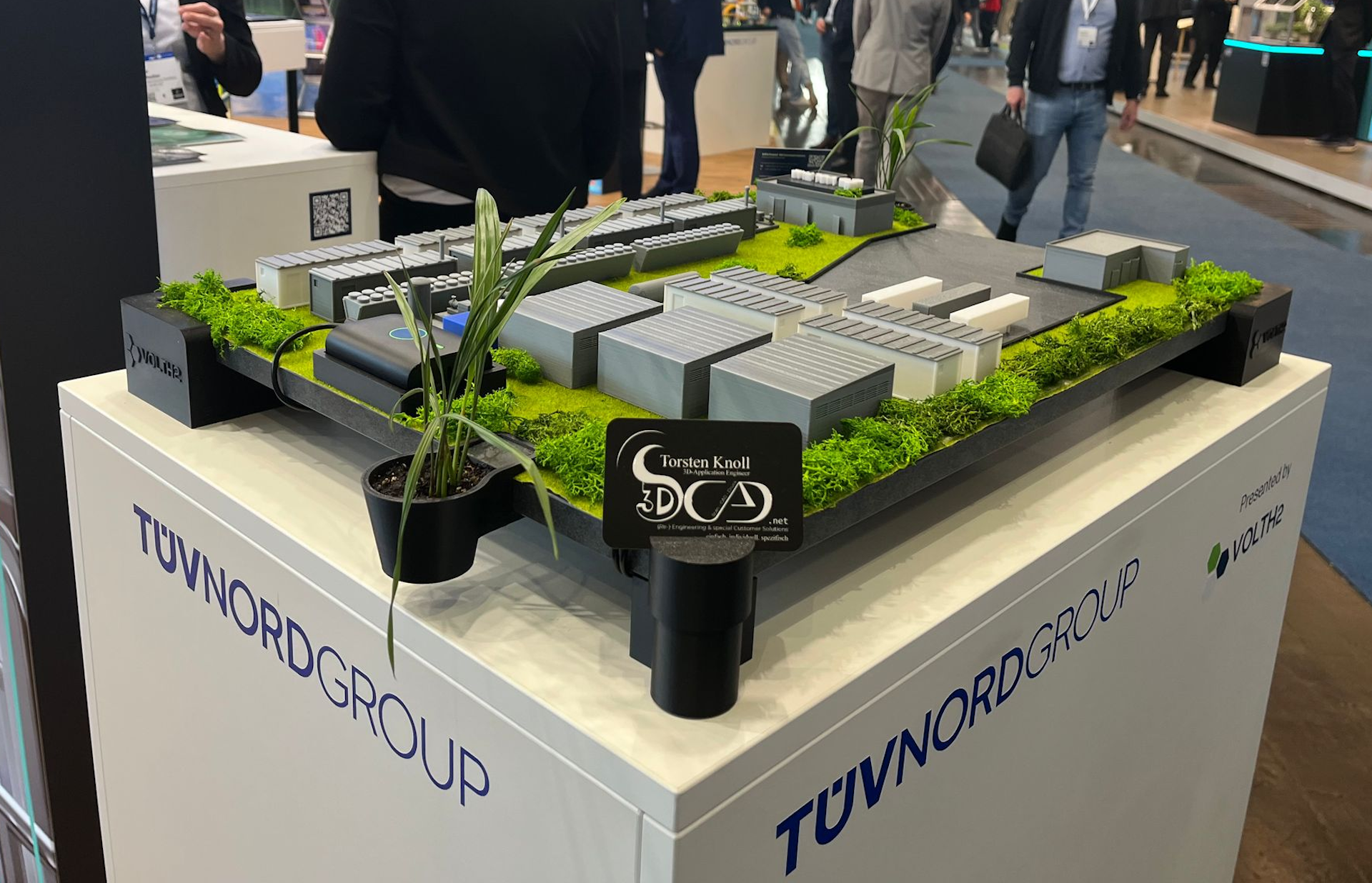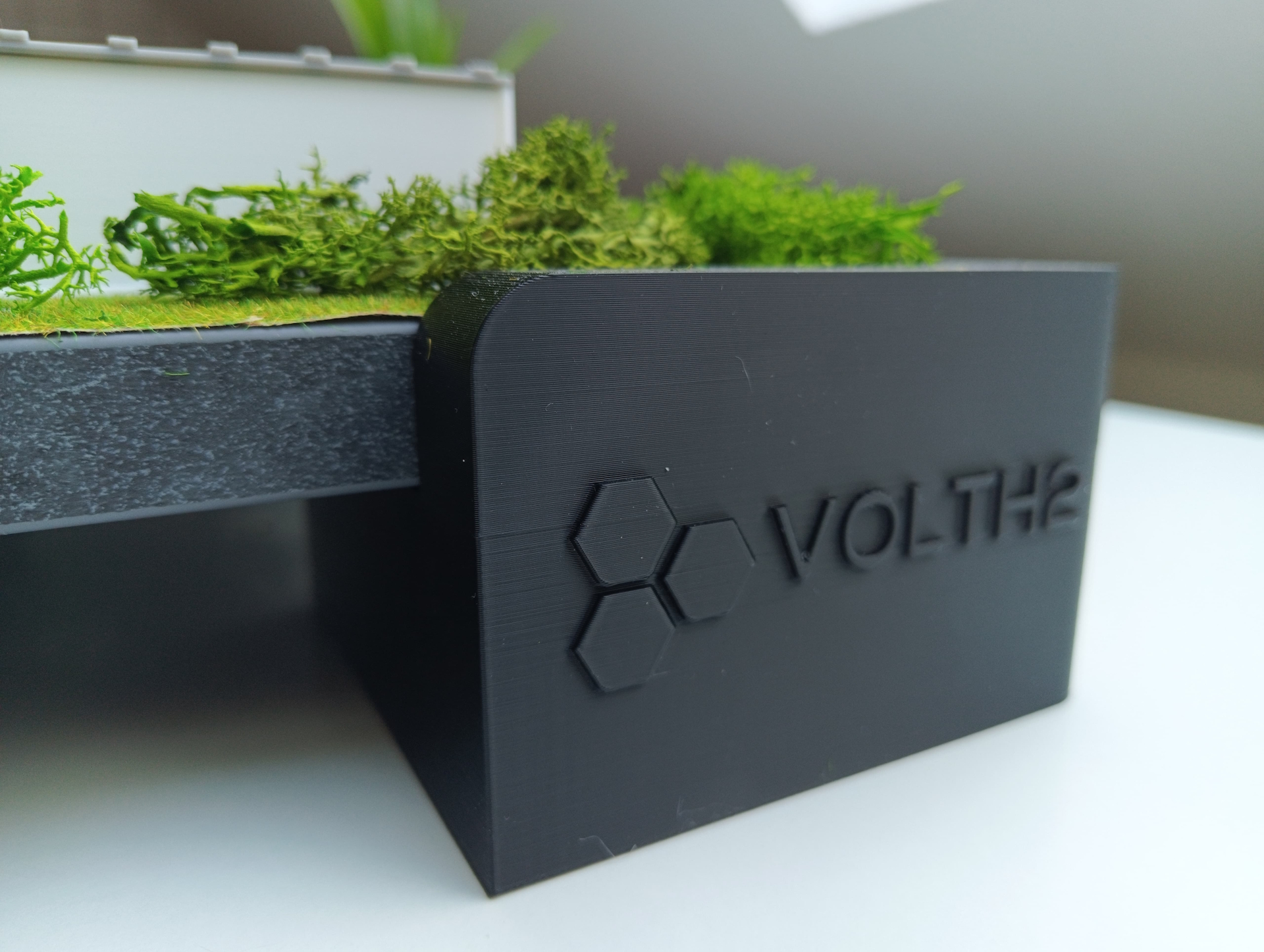 3D Exponat Wasserstoff Tankstelle - ausgestellt auf der Hannover Messe 2025. 19mm Holzplatte in Schieferoptik, 3D-Druckteile, intergriertes Firmenlogo, echtes Island-Moos und Pflanzen, Modellbau Kunstrasen, App gesteurte RGBIC LED-Unterbodenbeleuchtung mit USB-Powerbank